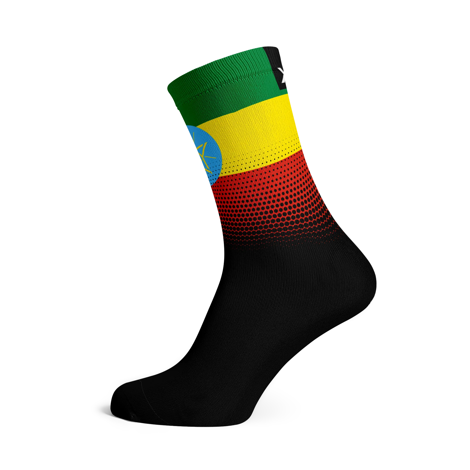 The official national flag of Ethiopia is on the top band of the sock with a faded background from heel to toe. Represent your country and wear the flag with pride.nn